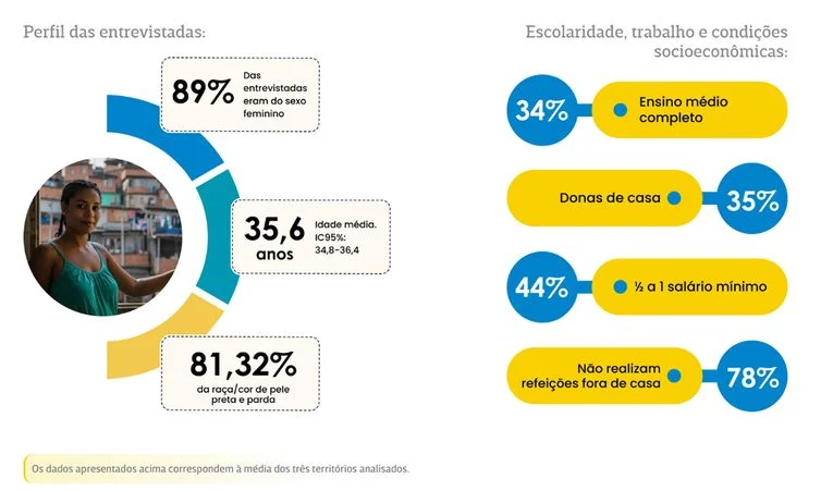 O perfil das famílias entrevistadas reforça a vulnerabilidade social: 89% dos responsáveis pela alimentação são mulheres, majoritariamente negras, e os domicílios têm, em média, quatro pessoas.
